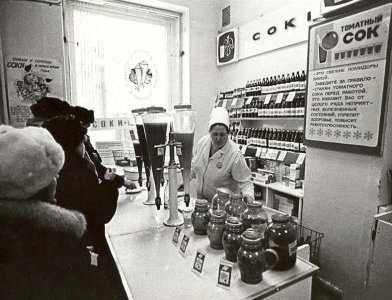Также можно припомнить наличие стойки, оснащенные тремя конусами из стекла, снизу которых располагались краники. Сами конусы были заполнены различными соками. Наибольшим спросом пользовались такие:
