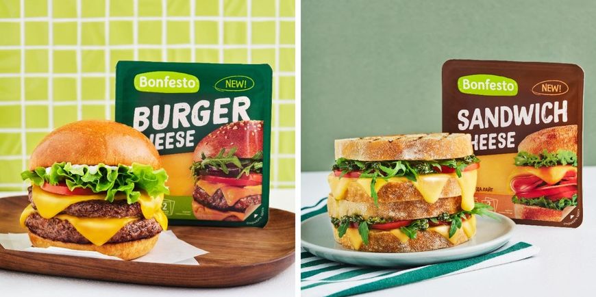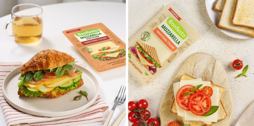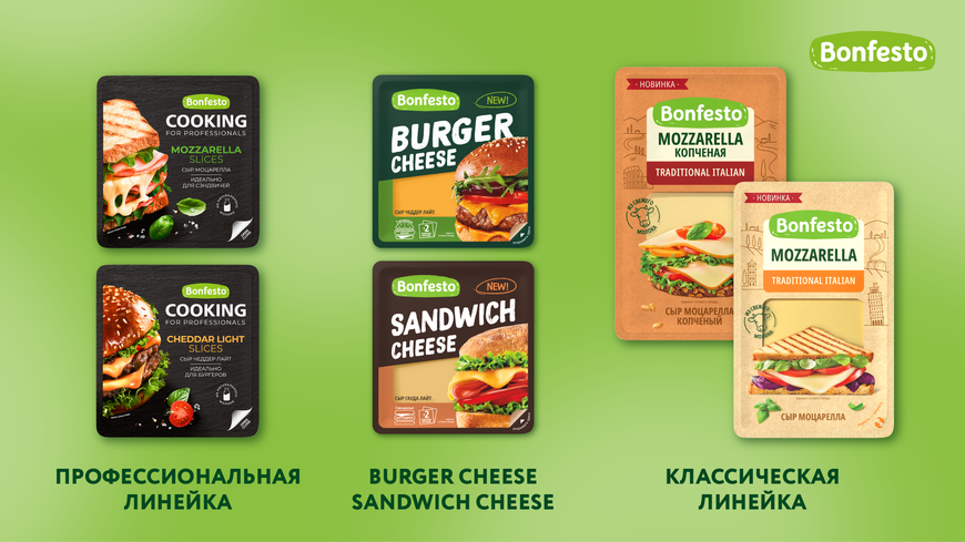 Новый продукт под брендом Bonfesto заметно отличается от других слайсированных предложений. Он выпускается сразу в трех продуктовых линейках: классической (моцарелла и копченая моцарелла), специальной (для бургеров и сэндвичей) и профессиональной Bonfesto Cooking — для HoReCa и фастфуда.