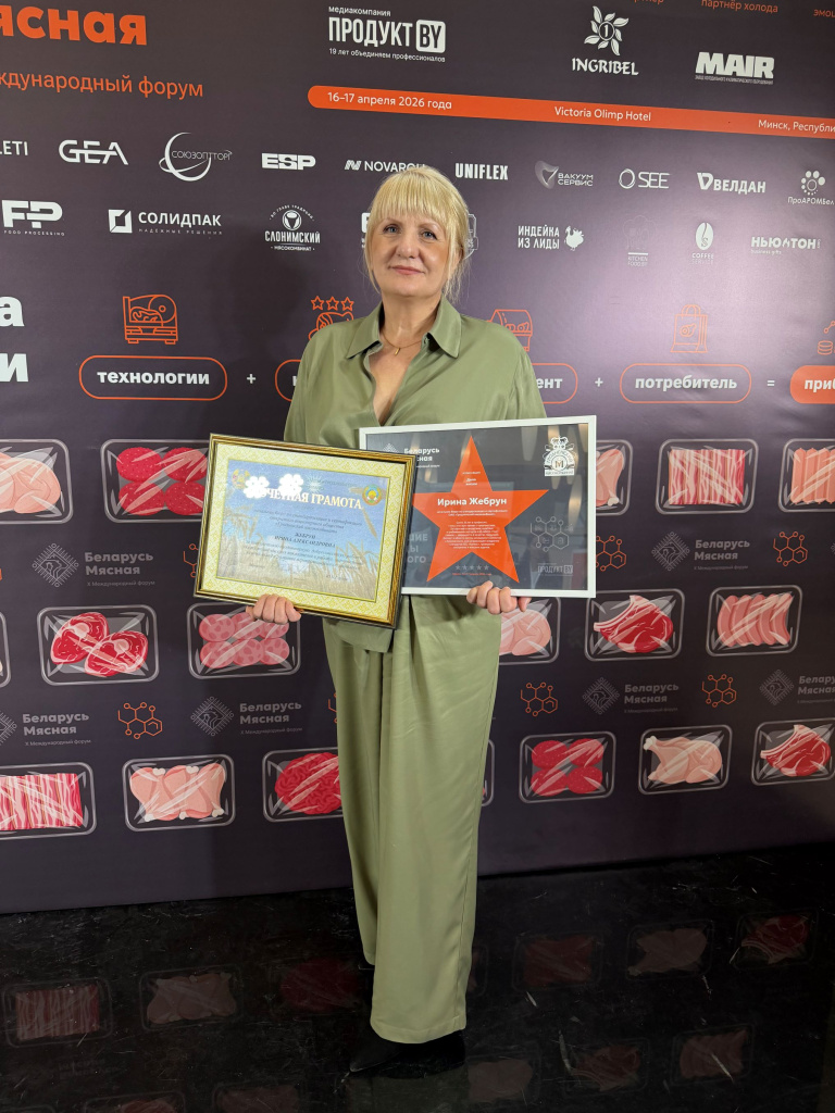 Награду в номинации «Дело жизни» получила Ирина Александровна Жебрун — начальник бюро по стандартизации и сертификации ОАО «Гродненский мясокомбинат». Более 36 лет в профессии, и весь этот путь связан с предприятием. За строгими стандартами, аудитами и требованиями экспорта в её работе стоит главное — уверенность в качестве продукции.