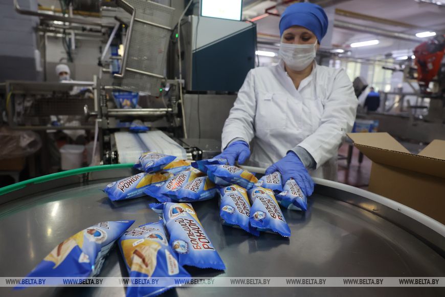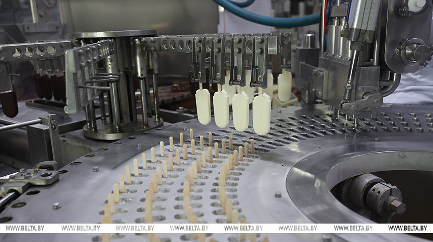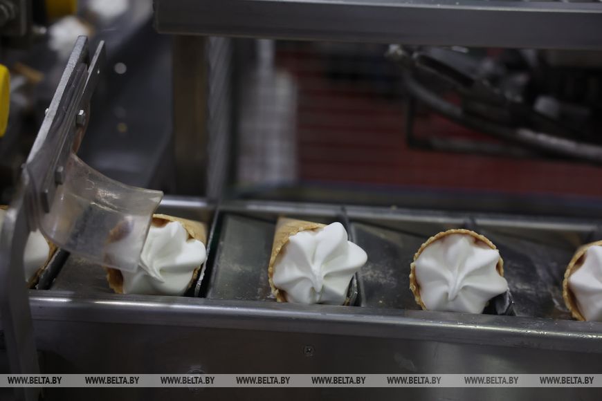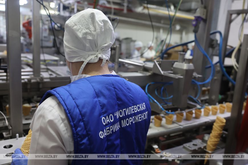 Как рассказал директор фабрики Николай Шепелевич, в год тут производят около 150 вагонов мороженого. Предприятие серьезно приросло в экспорте: могилевское мороженое можно найти в России, Грузии, Армении, Китае и не только. Здесь производят не только мороженое: творожные изделия на венских вафлях, полуфабрикаты из замороженного теста. Последние, кстати, создавали совместно с Белорусским государственным университетом пищевых и химических технологий.