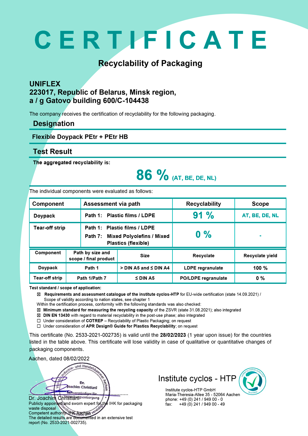 Возможность и процент переработки в исходное сырье подтвердил немецкий институт Cyclos-HTP GmbH, ведущий эксперт Германии в области управления отходами и материальными потоками, который оказывает услуги по классификации, оценке и тестированию пригодности к переработке упаковки и товаров.