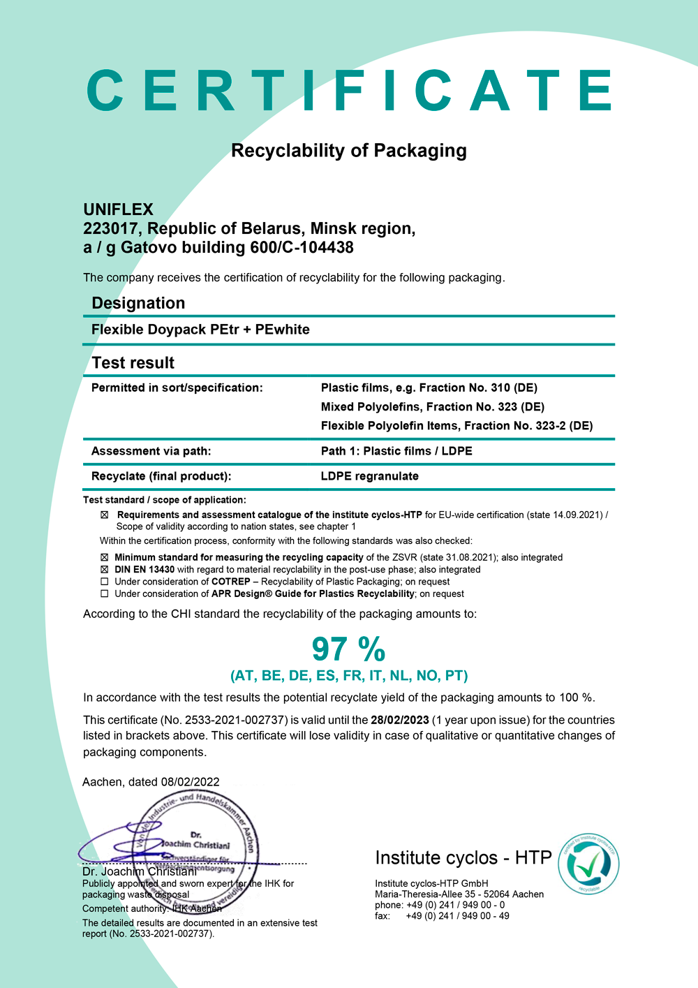 Экологичность упаковки «Унифлекс» подтверждена сертификатами европейского института Cyclos-HTP GmbH