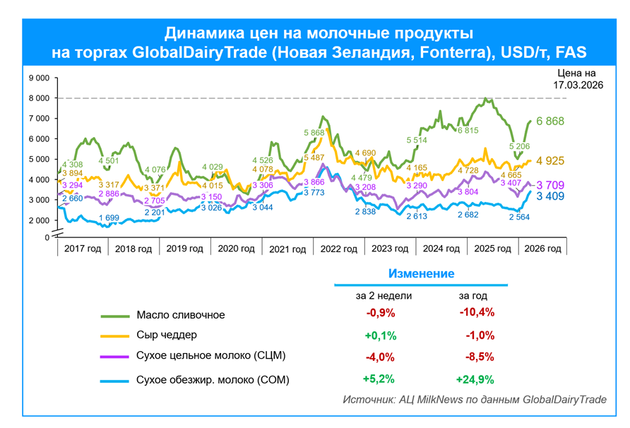 По итогам прошедших торгов средняя цена контрактов (в долларовом эквиваленте) на поставку СОМ превысила уровень середины марта 2025 г. на 24,9%, в то время как цена на СЦМ опустилась ниже уровня того же периода 2025 г. на 8,5%, сливочного масла — на 10,4%, сыра чеддер — на 1,0%. Значение среднего индекса GDT остается выше уровня прошлого года на 1,8% (+22 пт.).