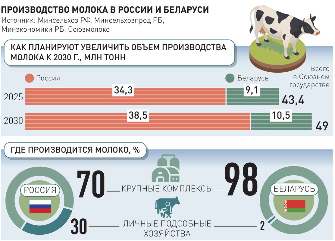 По планам России, объем поставок молочной продукции к 2030 году должен вырасти до 1,2 млн тонн в молочном эквиваленте против примерно 600 тыс. тонн в 2024 году. Однако без координации с Беларусью эти планы рискуют усилить давление на внутренний рынок Союзного государства.