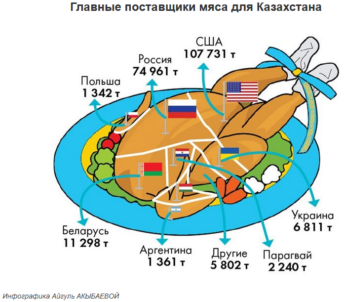 За два месяца 2019 года Казахстан импортировал 19 тысяч тонн, а за рубеж смог продать только 2,7 тонны мяса и мясопродуктов. Главная товарная позиция — птица: мы закупили почти 11 тысяч тонн по доллару за кило.