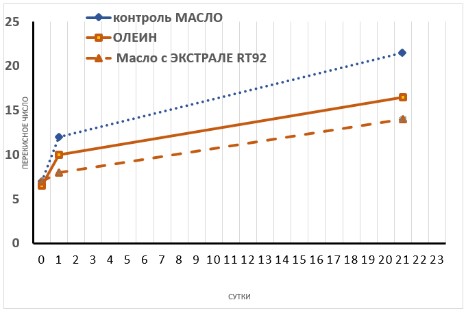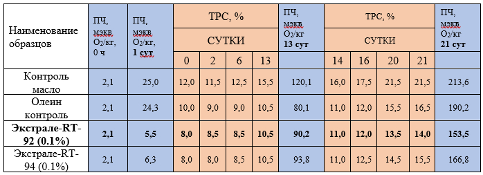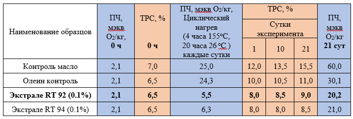 - Как видно из представленных данных наши добавки «Экстрале RT» арт. 92 обладают высокой эффективностью — замедляют окисление масла, в сравнении с пальмовым олеином и, тем более, в сравнении с чистым подсолнечным маслом. Общее количество полярных соединений в опытных образцах снижается на 15-20%, а перекисное число снижается 40-45%.
