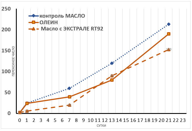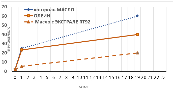- Из полученных данных также видно, что во время хранения масел при комнатной температуре наши антиокислители ведут себя более эффективно, чем при повышенной температуре.
