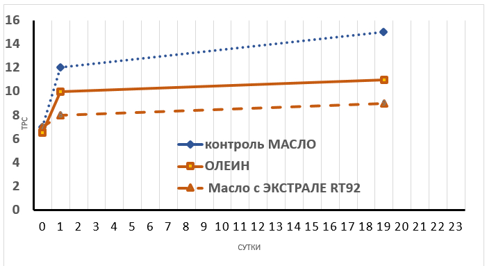 Рис .2. Влияние добавок комплексных пищевых «Экстрале RT» арт. 92, на изменение ТРС подсолнечного масла по сравнению с Пальмовым олеином при циклическом нагреве (4 часа — 155оС, 20 часа — 26оС каждые сутки)